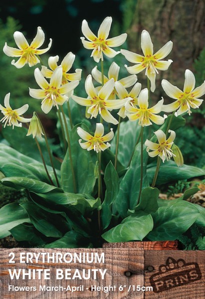 Erythronium White Beauty. Strongly marbled leaves, in bronze and green, below spikes of large creamy flowers. These are yellow in the centre and have a rusty-red throat ring and appear in March-April. 6″/15cm Height. Pack Contents 2 Bulbs.