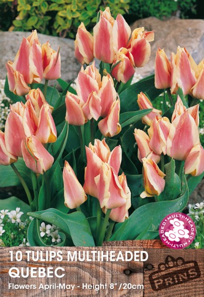 Tulips Multiheaded – Quebec. A beautiful Variety, with pink flowers, with a Cream edge. Flowers April – May. 8″/20cm Height. Pack Contents 10 Bulbs.